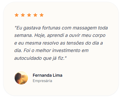 E o melhor: você poderá praticar a automassagem sozinho(a), com segurança, sem precisar de nenhum conhecimento prévio sobre anatomia, terapia manual ou técnicas corporais.